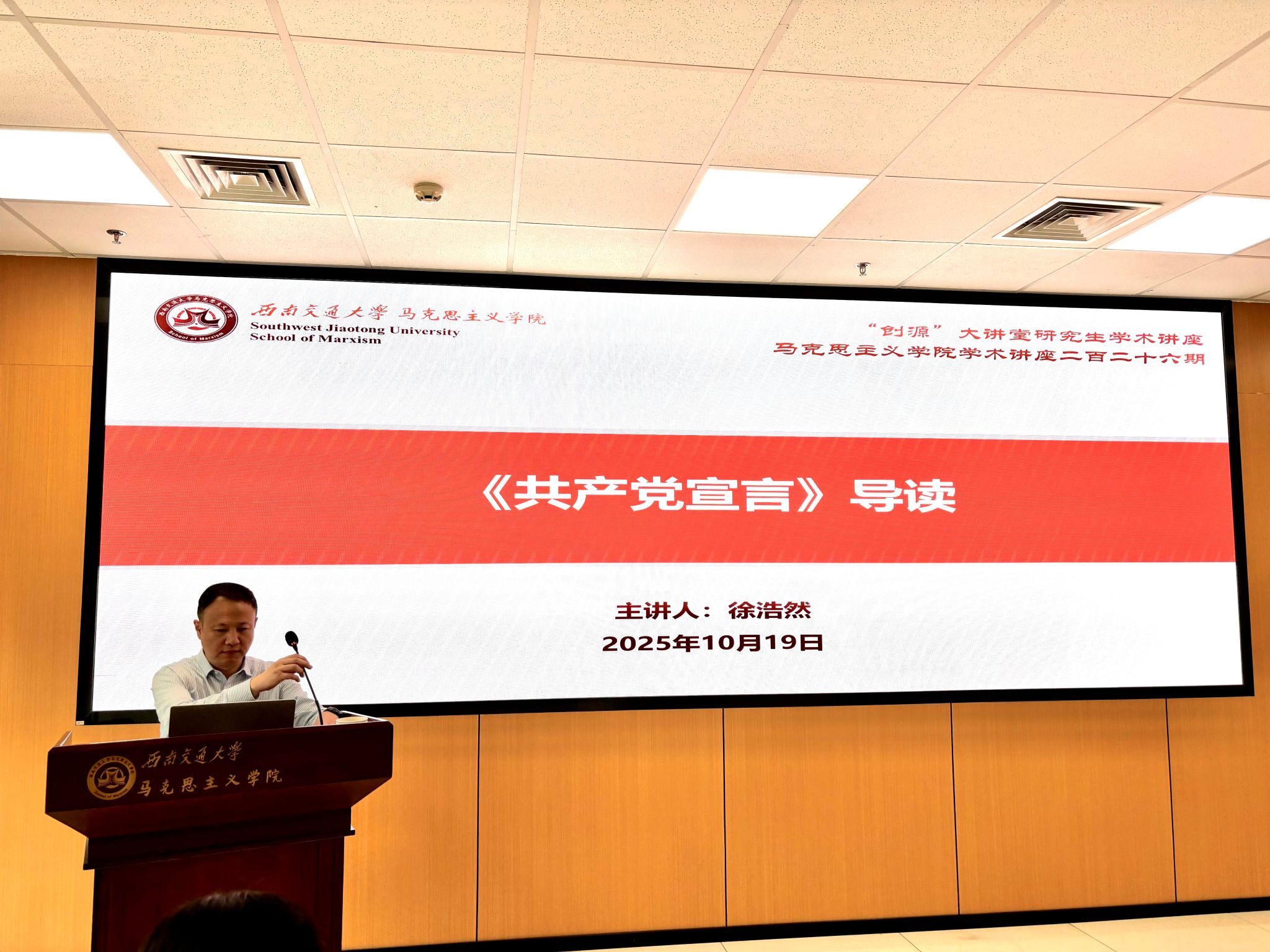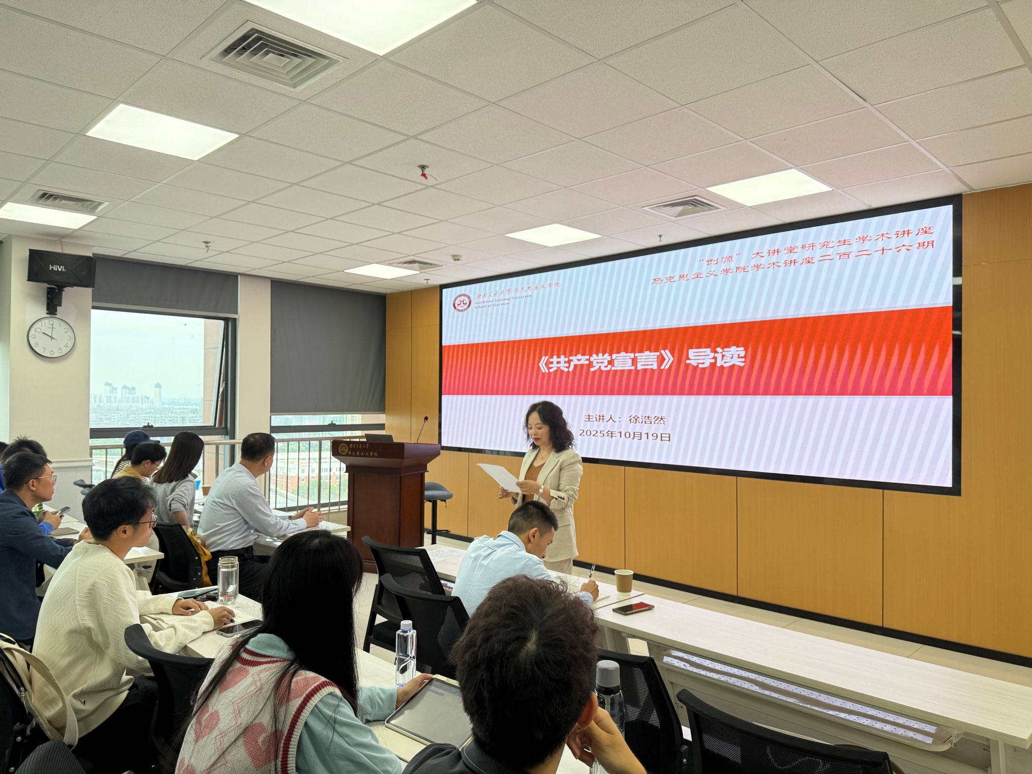 10月19日,中央党校(国家行政学院)科学社会主义教研部博士生导师、社会主义发展史教研室主任徐浩然教授为我院的硕士、博士研究生带来了一场以《共产党宣言》导读为主题的专题讲座。讲座由365英国上市公司副院长谢瑜主持。